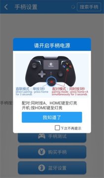 2.界面切换后,会有醒目的提示:“请开启手柄电源”。此时按住手柄“A”键,再按手柄“HOME”键启动手柄,手柄指示灯图标()快速闪烁则表示开始配对;