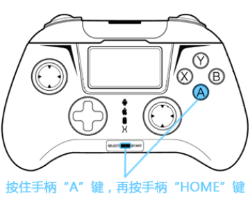 根据第一步提示启动手柄时,按住手柄“B”键,再按手柄“HOME”键启动手柄;这个模式同上面按住A键进入区别无鼠标模式功能,连接后仅亮起指示灯图标(