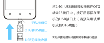 A.将2.4G USB无线接收器和OTG转USB接口连接上,然后将OTG转换接口的另一端和手机的USB接口连接(可根据自己设备的USB接口大小的情况选择是否使用OTG转换接口,前提是设备必须支持OTG功能);