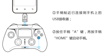 B.手机和USB无线接收器连接之后,将手柄帖近接收器(尽量减少其他信号干扰)按住手柄的“A”键,再按手柄的“HOME”键启动手柄进行连接(与蓝牙的连接启动方式一致)。