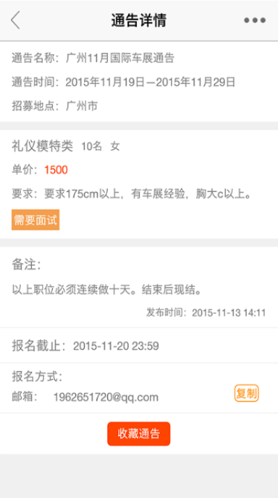 3、通告收藏一键收藏心仪通告,及时跟踪通告的状态