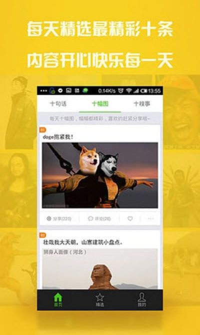 十句话是一个幽默搞笑的手机段子软件,它会每天为用户精选10句搞笑的话、10张幽默风趣的图片和10件让人忍俊不禁的糗事,让大家每天都生活在欢声笑语之中,感兴趣的朋友快来免费下载体验吧!