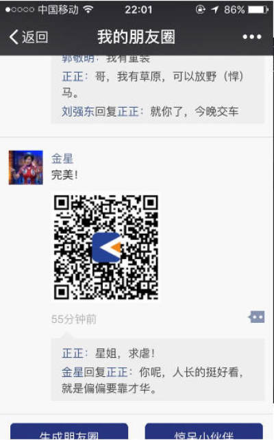 微信朋友圈内容生成器可以让你在朋友圈装逼,各种名人给你点赞等等,通过它你可以自定义你的微信头像、名称、内容、图片、发布时间、赞的人、评论等,达到任何你想要修改的结果,生成的图片1:1真实微信朋友圈。