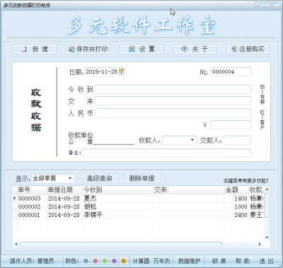 多元收款收据打印助手(收款收据打印软件)是一款简单专业的收款收据打印软件;软件支持自定义新建收据、打印保存、打印设置、及搜索查询等等功能;适用于企业、店铺等进行收据编辑打印操作,功能实用,有需要的朋友赶紧下载体验一下吧。