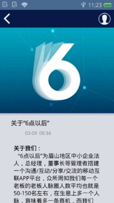 “6点以后”为眉山地区中小企业法人,总经理,董事长等管理者搭建一个沟通/互动/分享/交流的移动互联APP平台,众所周知我们每一个老板的老板人脉圈人数平均也就是50-150名左右,在生意上多一个人脉,意味着多一条商机,而我们——“6点以后”力争在眉山地区三年内搭建一个5000人的人脉圈,为您的生意增加10倍利润。