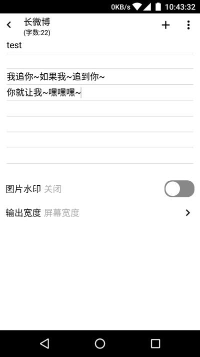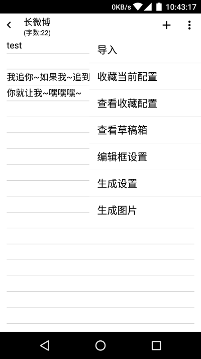 7.支持简单长微博,最优雅的排版,给你信纸的输入体验,最清晰的文字输出,图片误差小于1个像素,所见即所得的编辑器,最纯粹的文字转图片生成器,支持完全无广告无水印,长微博编辑器支持修改字体,修改字体大小,字体颜色,长微博的背景色,修改行距等,支持自定义输出图片宽度,针对新浪微博特别优化,暂不支持图文混排的长微博,所有长微博均可以转存为记事本到本地sdcard,另外长微博已经支持从本地sdcard导入TXT文本文件,支持几种常见的字符编码自动识别转换,不会出现乱码问题啦。