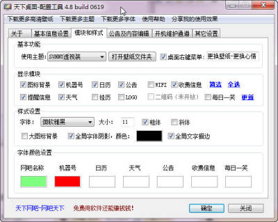 天下桌面是一款简单实用的电脑桌面美化工具,一般适用于网吧进行整个系统电脑桌面设置;功能强大,可自定义下载或更换壁纸,还可以附加网吧信息、电脑机号、日历、公告等信息提示,可自定义字体,美观实用,功能全面,操作简单,需要的朋友朋友快下载试试吧!