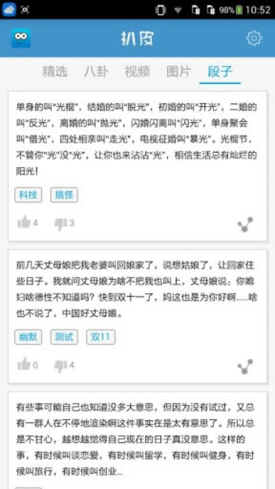 扒皮是一个可以给大家带来欢乐的手机应用,这里精选了大量幽默搞笑的段子和图片,且每日更新,同时用户朋友还可以将这些段子和自己的好友一起分享,让笑声在朋友之间相互传递,感兴趣的朋友快来看看吧!
