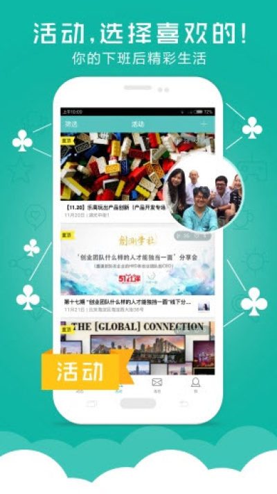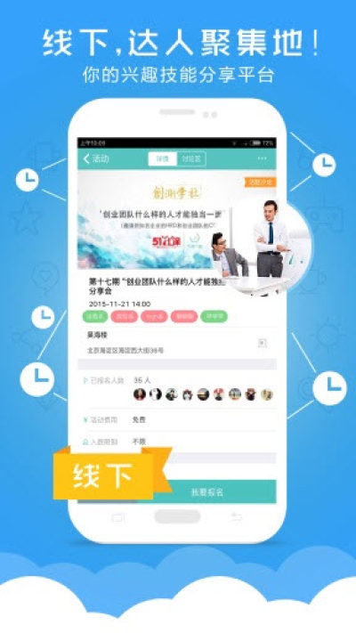 3.是一款为职场白领量身定制的产品,针对年轻职场人的两大突出需求,结交人脉和学习新鲜知识,结合下班后场景(更轻松、互动性更强),为用户推荐高品质的活动内容。