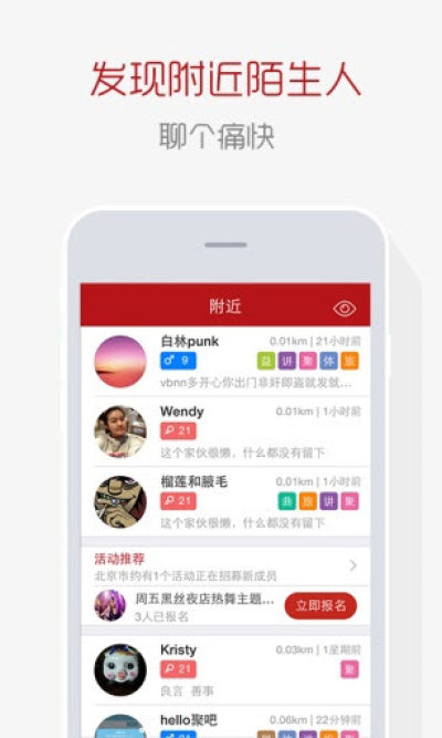 快速联系和认识朋友、轻松参与活动,让聚会更简单更便捷!聚会就在一瞬间!