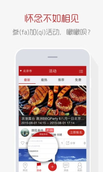 2.活动:每天发布不同种类的活动,号召志趣相投的朋友一起玩耍。