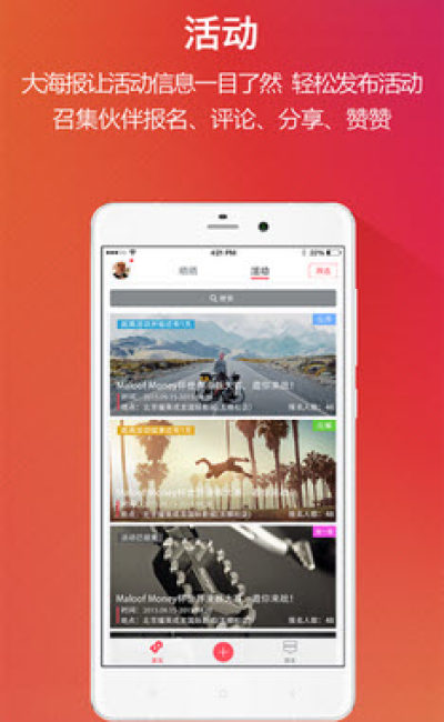 这款爱活动手机应用可以帮助你找到周边志趣相投的朋友,用户可以在这里参加别人发起的各种活动,同时也可以自己发起活动,等待身边有相同兴趣的朋友来参加。这款软件可以让大家的业余生活不再枯燥乏味,同时还可以结交大量的好友,感兴趣的朋友快加入进来吧!