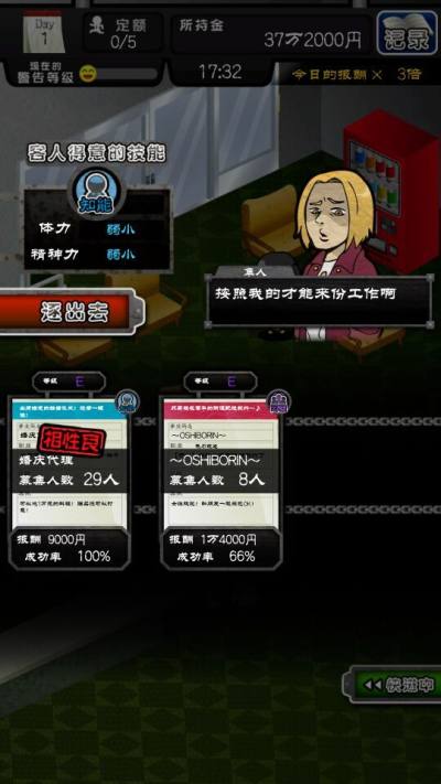游戏中玩家最多手上能有 6 个案件,而每天只要介绍满 5 个人或是到 24 点就会自动结束营业,而职业介绍是否成功取决于求职人和工作的适合程度