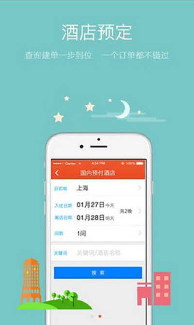 3.支持国内预付酒店查询预定,随时预订近万家特惠酒店;