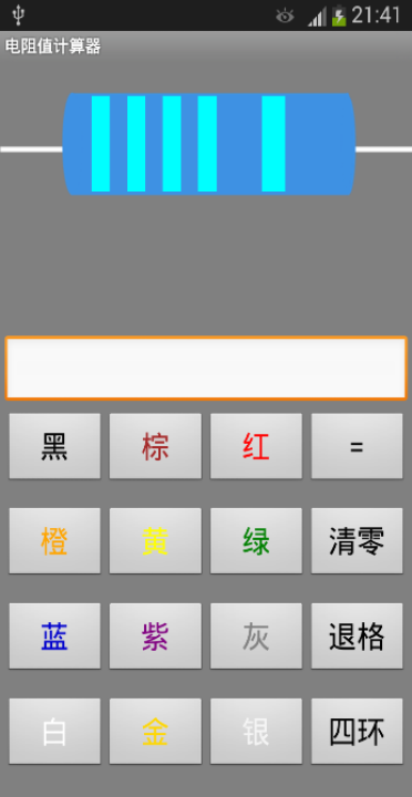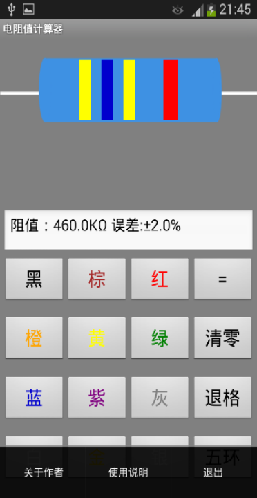 快速计算色环电阻阻值,用户可以通过屏幕直接输入色环电阻上对应位置色环的颜色,程序自动计算出改电阻的阻值和误差,支持四环电阻和五环电阻,采用仿计算器界面,按键设计合理,操作起来非常方便,绝对会是您的一个好帮手