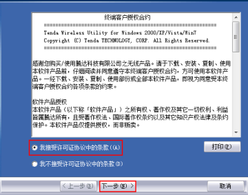 3.在随后的页面中选择“安装驱动程序与Tenda无线网络设定程序”点击“下一步”