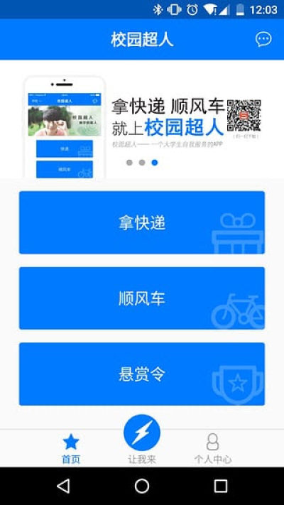 校园超人是一个既全面、又贴心的校园生活服务平台,各种服务项目应有尽有,如取快递、招兼职和坐顺风车等等,满足大家的各种校园生活需求,欢迎大家来免费下载使用!