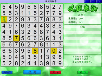 本软件独创数学游戏,锻炼你的乘法口算能力。游戏目标:消除所有绿色数字方块。消除规则:选择3-8个数字方块,如果它们满足两个条件,这些方块就会被消除。1、它们可以组成一个乘法等式;2、每个方块必须和其它方块相邻。通过这个游戏,你的乘法口诀一定会滚瓜烂熟的!