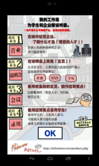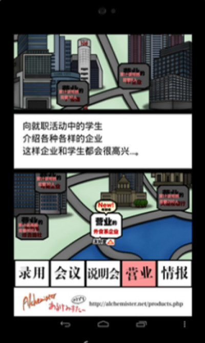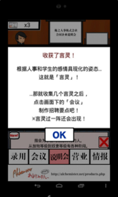 为了解决就业难、招聘难的窘境,玩家将扮演一位职业中介者的形象,为需要求职的学生介绍合适的工作,也为需要招募相应人才的公司提供方便。算是一款超欢脱的模拟经营游戏,放置的要素并不多,文本量倒是挺大,并且其中有各种奇葩的梗儿,招聘方有例如苹果公司的乔布斯总裁、半泽直树中的大和田常务等,应聘方有脸书的创始人以及各种机器人、高达和太子党等。你说画风奇葩?嗯,不要在意细节。