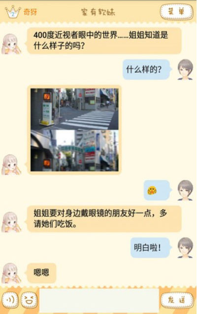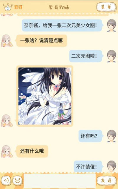 家有软妹是一款与虚拟角色对话的手游,游戏中玩家的对话对象是你的虚拟妹妹,你可以在聊天栏里和她聊任何事情哦,游戏玩法简单,记得每天和你的妹妹聊聊天