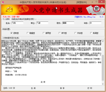 入党申请书生成器是专为广大用户志愿入党的申请书生成工具。可以不用自己手写或者输入内容,输入名字等信息即可一键生存内容,支持多种类型风格,每次生成的内容都不同,非常方便易用,欢迎下载!