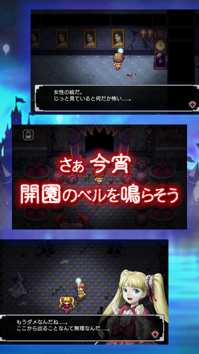 本作中,在游乐园里面一边逛,一边依靠线索的逃出系游戏。游戏中一些可怕的背景以及一些散落各地的陷阱让玩家深陷恐怖之中。游戏中登场的迷之角色,还有临场感十足的BGM,也是一大玩的点。