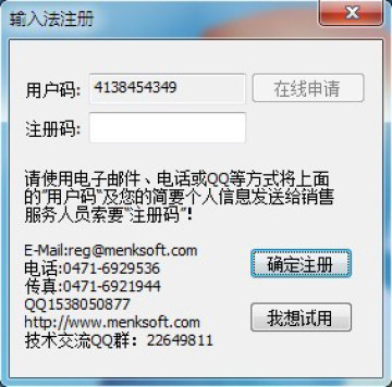 启动输入法,弹出输入法注册框单击我想试用可试用。单击确定注册可授权注册,通过注册框上的联系方式获得注册码。图1-7.