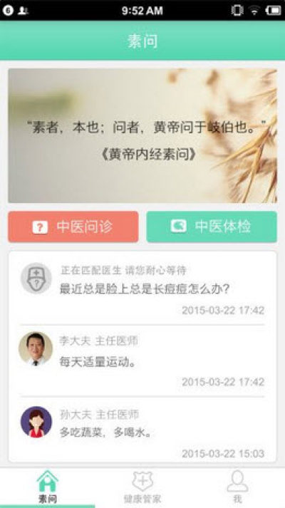 【素问】APP是专为女性用户打造的一对一专业中医问答平台。 这里为用户提供了包括美体美颜,乳腺保健,妇科调养,孕调护理,食疗养生等方面专家级的中医咨询。在解答问题的之后,医生还会出具详细的“调理建议”,利于用户更好的调理自己。 同时,程序中还提供自助形的中医体检,让用户更多的了解自己,才能更好的照顾自己。 【素问】希望借助移动科技的力量,让用户有问题速问医生,让调理随时随地。