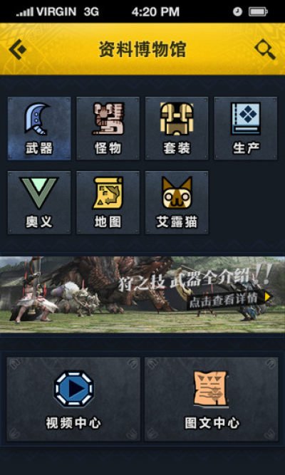 使用“掌上狩猎部APP”不仅能获得第一手的狩猎资讯,还能够查询配装、武器派生、怪物攻略等各种游戏资料。