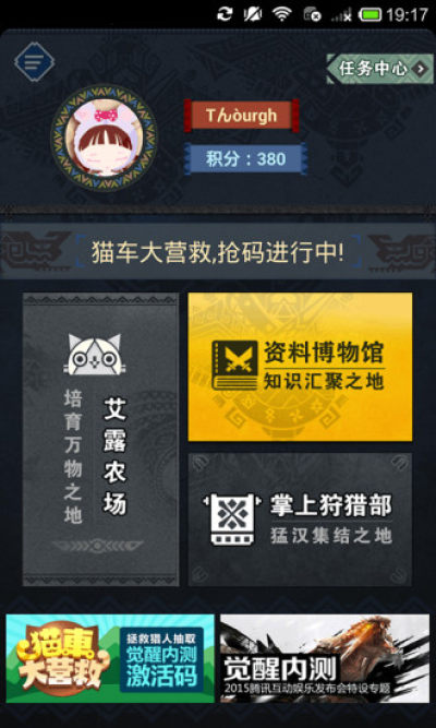 掌上狩猎部是怪物猎人OL官方推荐的一款APP,通过他你能够了解怪物猎人的第一手资讯,同时还能知道游戏的玩法,攻略,而且还可以通过积分兑换游戏中的道具,最最重要的是,激活码可以通过他来获得!