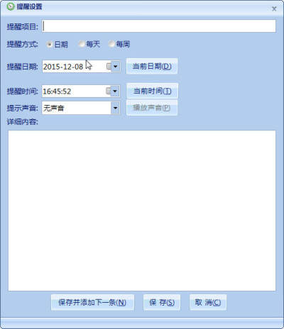 点击新增按钮,手动添加提醒项目(同时支持修改和删除项目):设置项目名称、提醒方式(日期、每天、每周)、提醒时间、提示声音、详细内容