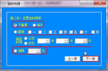 设置定时频率:选择是定时一次还是每天或者选择需要定时的日期;指定公历或者农历、间隔等,进入下一步