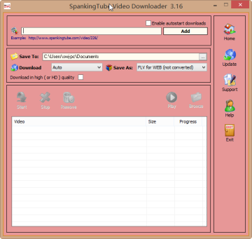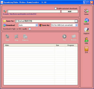 只需把视频的URL地址粘贴到本程序里,并选择保存位置和保存格式(AVI, MPEG 或FLV ),视频就会自动下载到指定的文件夹中。