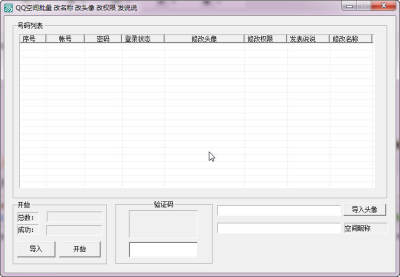 QQ空间批量改名称改头像改权限发说说是一款针对QQ空间平台的辅助工具;软件功能齐全,可以帮助用户修改QQ空间名称、头像、权限,并支持发说说,且操作简单,非常实用,感兴趣的朋友快下载试试吧!