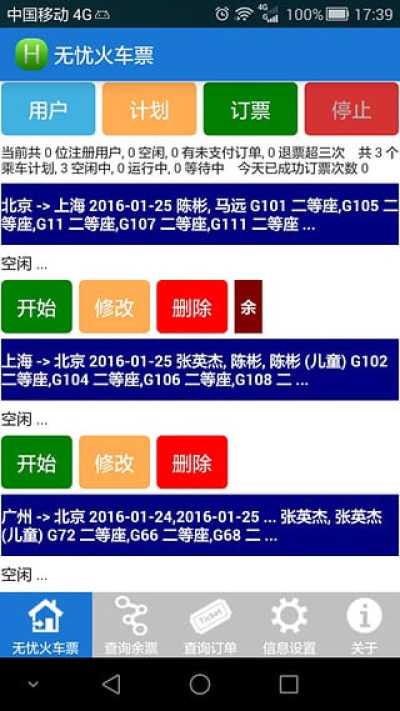 4.预先输入12306用户名和密码,设定好计划中的乘客信息, 火车信息, 便可一键全自动循环抢票。
