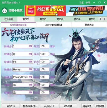 剑网3夜雨后台按键工具,日前更新到v3.1免费版,玩家可以通过这个工具完成不用切换到游戏也能按键的操作。玩家可以根据自己的意愿设置相应的键盘操作、鼠标操作、喊话操作,非常方便。