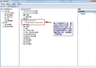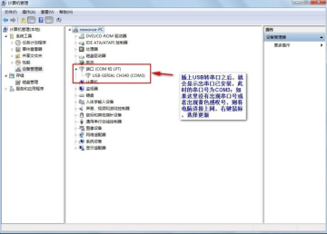 3.此时电脑设备管理器中会出现相应的串口设备,注意记住COM号,下图例为 COM4,如果电脑自动分配超过 COM9,应手动将其改回COM9 以下,手动更改右击这个串口设备在属性里面可以找到更改串口号的地方;