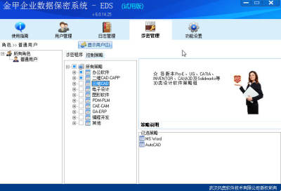 金甲企业数据保密系统EDS(Enterprise Data Security )是一款适用于企业级用户的数据保密软件,可以帮助企业有效管理和保护重要文件隐私安全,包括合同、方案书、设计图等等,可广泛应用于政府、军队、电信、金融、汽车、机械、电子、广告、软件、化工、管理等各类企事业单位;软件可自定义添加群组,支持备份操作,多种加密策略及重要文件强制加密功能,让你的企业资料更加安全,需要的朋友可以下载体验一下。