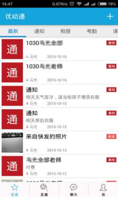 老师可进行校园信息发布,如通知、相册、课程、食谱、作业等;各类发布信息具备清晰的阅读标识或未阅标识。视频打卡设备便捷教师考勤工作。