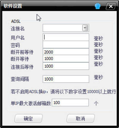 点击设置按钮,进入设置界面,登录ADSL帐号,设置断开等待时间、查询间隔、单个IP最大激活邮箱数等等