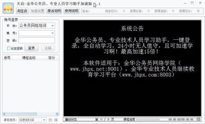 金华市专业技术人员继续教育学习助手加速版是一款适用于金华市技术人员、公务员的在线学习工具,具体帮助用户实现在线继续教育学习,操作简单,可多帐号登录加速学习,需要的朋友快下载试试吧!