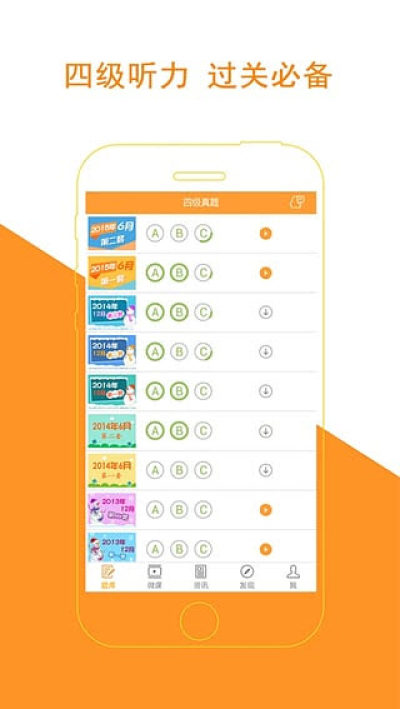 免费送四级真题书和词汇书,2006年-2015年6月英语四级真题听力全有。模拟练习,包括短对话、长对话、复合式听写等国家英语四级考试听力部分包含所有的题型,答题“交卷”以后答案会自动显示出来,真正体验四级考场上的感觉。此外此款软件还有收藏功能,可以收藏你打错的试题,方便你以后收听错题,且软件有统计成绩的功能,你可以对比你在不同时期做题的正确率。本软件包括2006年6月到2014年12月的所有四级听力真题,你可以随时随地的练习四级听力,确保你四级在最短的时间取得最高的成绩。