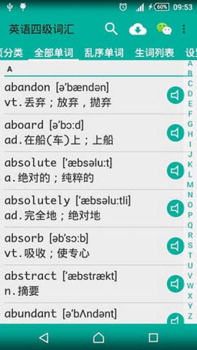 词汇是英语四级考试的基础,只要熟练掌握词汇量才能让自己轻松通过英语四级考试,小编今天给大家推荐的这款英语四级词汇是一个非常专业的学习工具,这里为大家提供的词汇都是今年CET4考试范围的,在考前最后一段时间,同学们可以通过这款软件来加深自己对词汇的掌握,希望它能帮助大家在考试中脱颖而出!