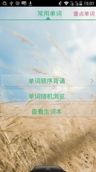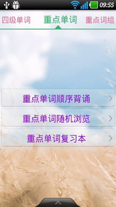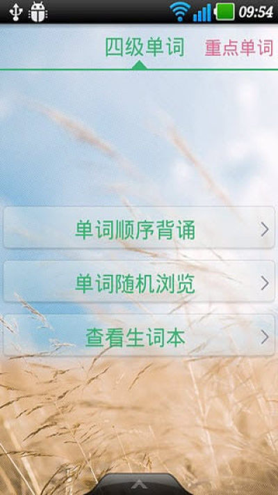 应用设有单词或词组顺序背诵、单词或词组随机浏览功能,可把生词加入生词库以便重点记忆,并加入四级考试安排,四级考试技巧,四级考试作文模板功能选择。