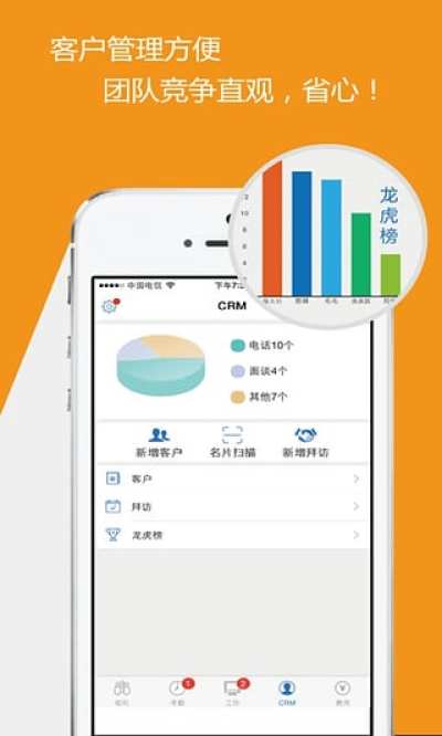客户资料统一管理,客户拜访实时跟进,扫描自动读取名片,业绩排名一目了然。