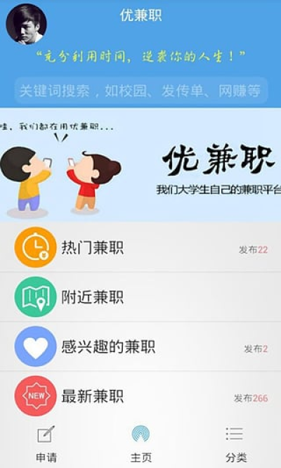 优兼职是一个非常安全的手机找兼职软件,用户朋友可以通过它来直接与企业联系,中间没有任何中介费用,让你可以安安心心的去做兼职,想找兼职的朋友必备哟!