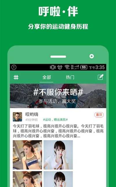 运动的魅力是燃烧卡路里的痛快,是志同道合的伙伴一起挥洒的汗水;这里是各路健身迷的聚集地,这里有你共同信念的人;随时随地发起话题,晒出你的数据,晒出你的成就;找到属于的你的“圈”,刷屏根本停不下来。