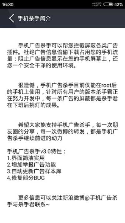 手机广告杀手,功能什么的就不多说了,有了这款软件,就可以远离各种讨厌的广告了。