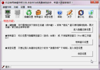 装模作样软件(老板不怕)是一款绿色实用的窗口隐藏辅助工具,可以帮助用户快速隐藏当前桌面的操作,包括游戏、视频、QQ等等,再也不担心领导突击检查了;软件支持一键隐藏或自定义隐藏部分程序,您还可以设置保密功能,将软件隐藏起来,操作简单,功能实用,需要的朋友可以下载体验一下。