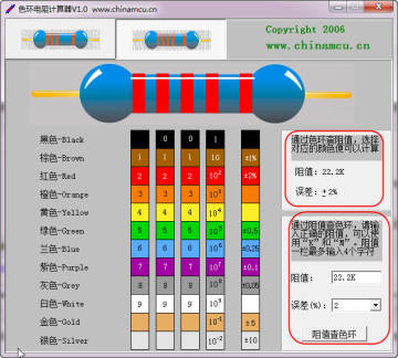 通过阻值查色环:在输入框内输入正确的阻值,设置误差范围,点击阻值查色环按钮,即可快速显示色环